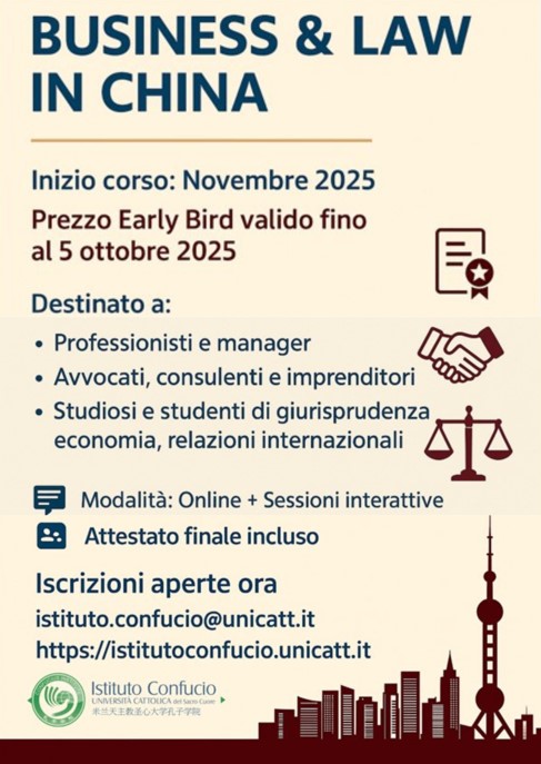 Scopri la nuova edizione del corso Business & Law in China (novembre 2025 - aprile 2026): un percorso formativo per approfondire le dinamiche legali e commerciali della Cina contemporanea. Promo Early Bird attiva fino al 5 ottobre, clicca qui per iscriverti e consultare il programma completo!